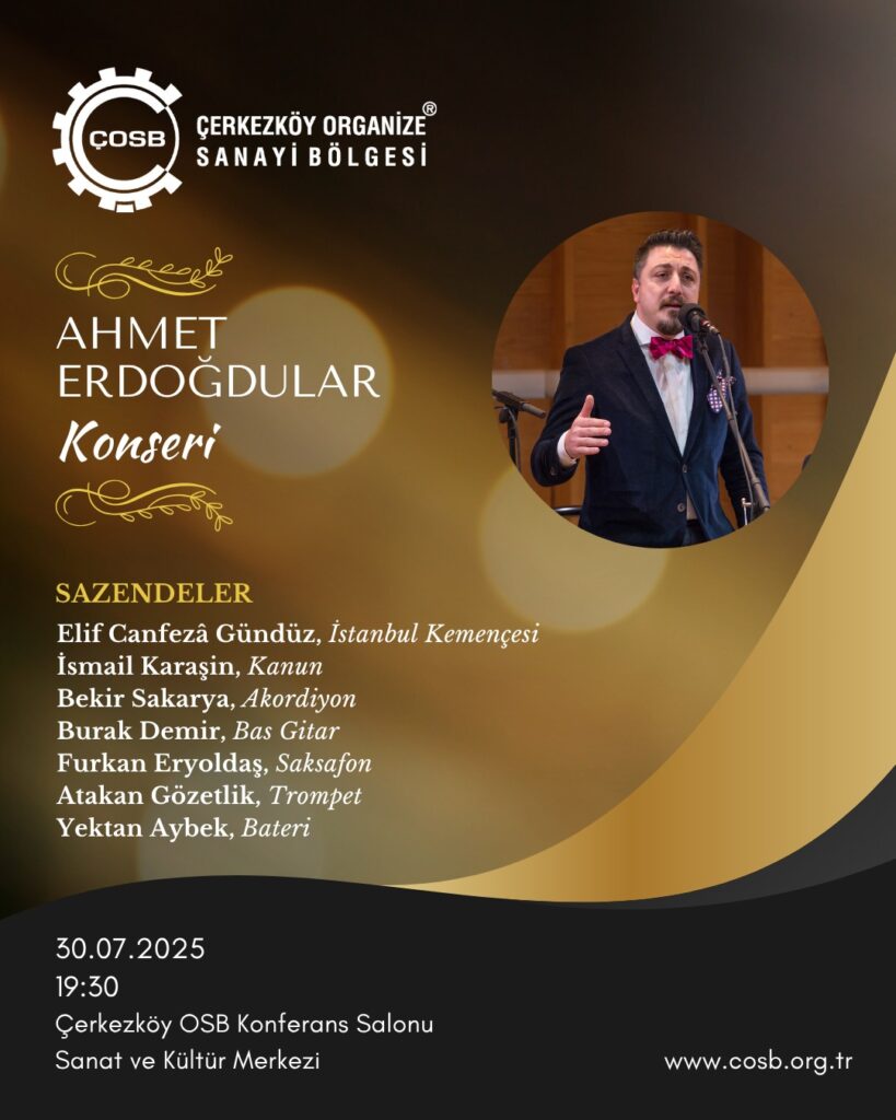 Çerkezköy Organize Sanayi Bölgesi (ÇOSB), Türk müziği sanatçısı Ahmet Erdoğdular’ı 30 Temmuz 2025 Çarşamba akşamı düzenlenecek özel bir konserle ağırlayacak. ÇOSB Konferans Salonu’nda saat 19:30’da başlayacak etkinlik, tüm sanatseverlere açık olacak.