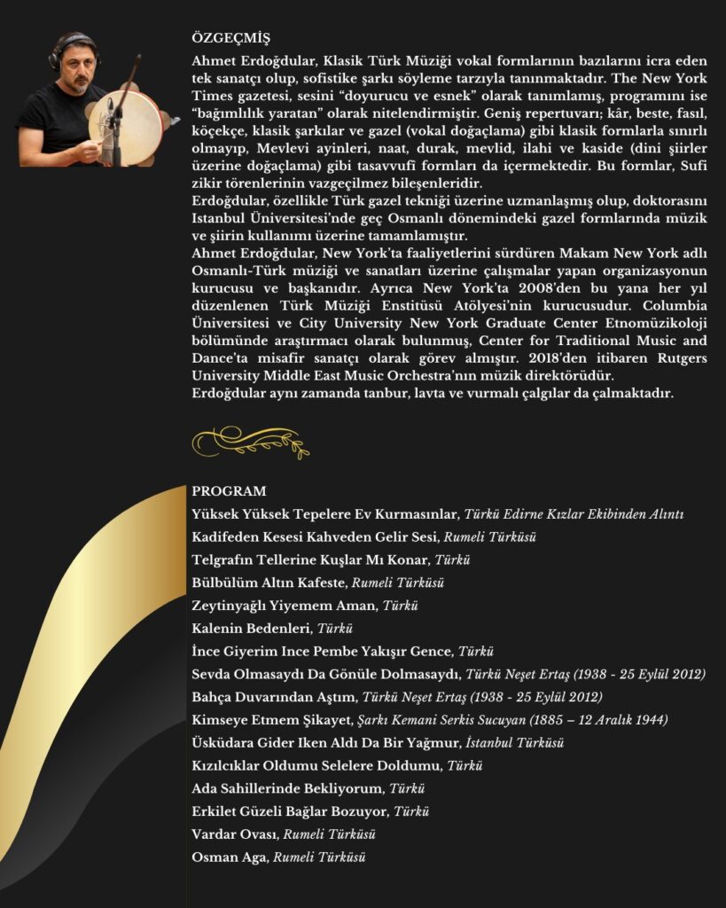 New York Times tarafından “doyurucu ve esnek sesi” ile övgü toplayan ve akademik çalışmalarıyla da tanınan Erdoğdular, gecede usta müzisyenlerden oluşan orkestrasıyla sahne alacak. Sanatçı, Rumeli türkülerinden Neşet Ertaş klasiklerine, “Üsküdara Gider İken” gibi İstanbul şarkılarından “Kimseye Etmem Şikayet” gibi sevilen eserlere uzanan zengin bir repertuvarı seslendirecek.