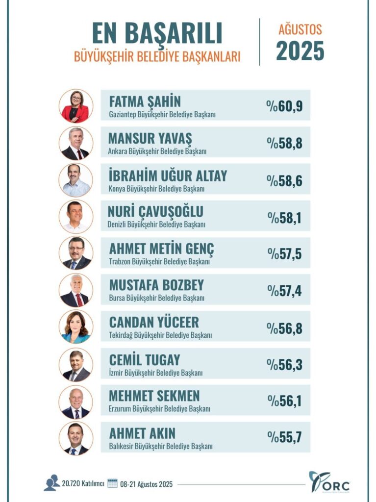 Araştırmada, Gaziantep Büyükşehir Belediye Başkanı Fatma Şahin yüzde 60,9 ile birinci, Ankara Büyükşehir Belediye Başkanı Mansur Yavaş yüzde 58,8 ile ikinci, Konya Büyükşehir Belediye Başkanı İbrahim Uğur Altay yüzde 58,6 ile üçüncü sırada yer aldı. Tekirdağ Büyükşehir Belediye Başkanı Dr. Candan Yüceer ise yüzde 56,8 oranla Türkiye genelinde yedinci sırada yer aldı.
