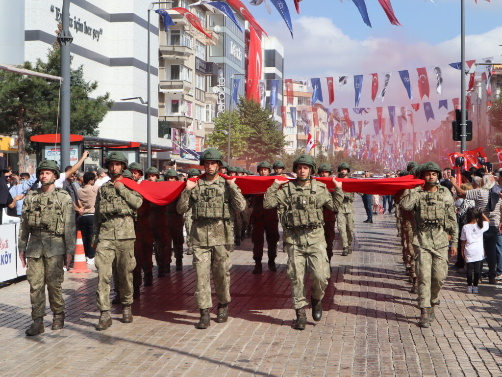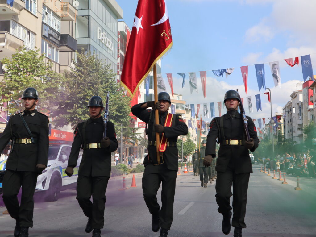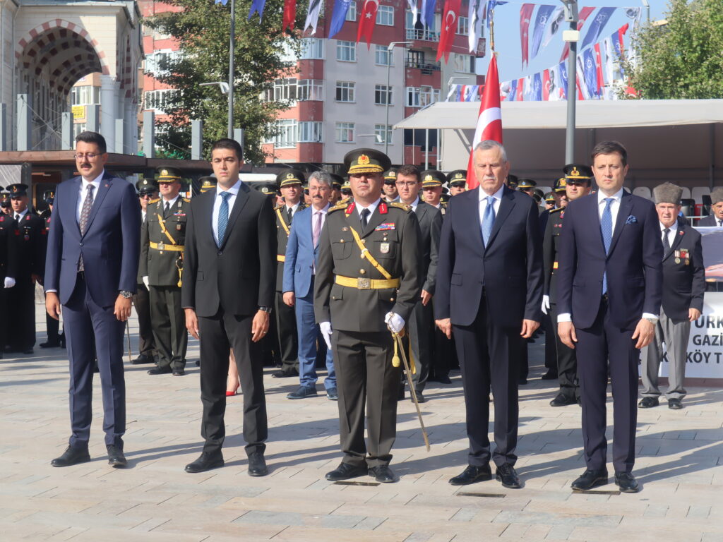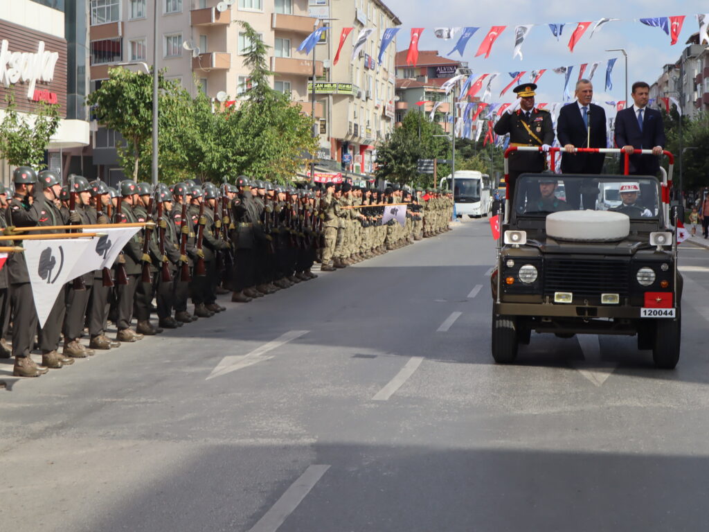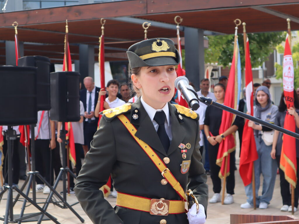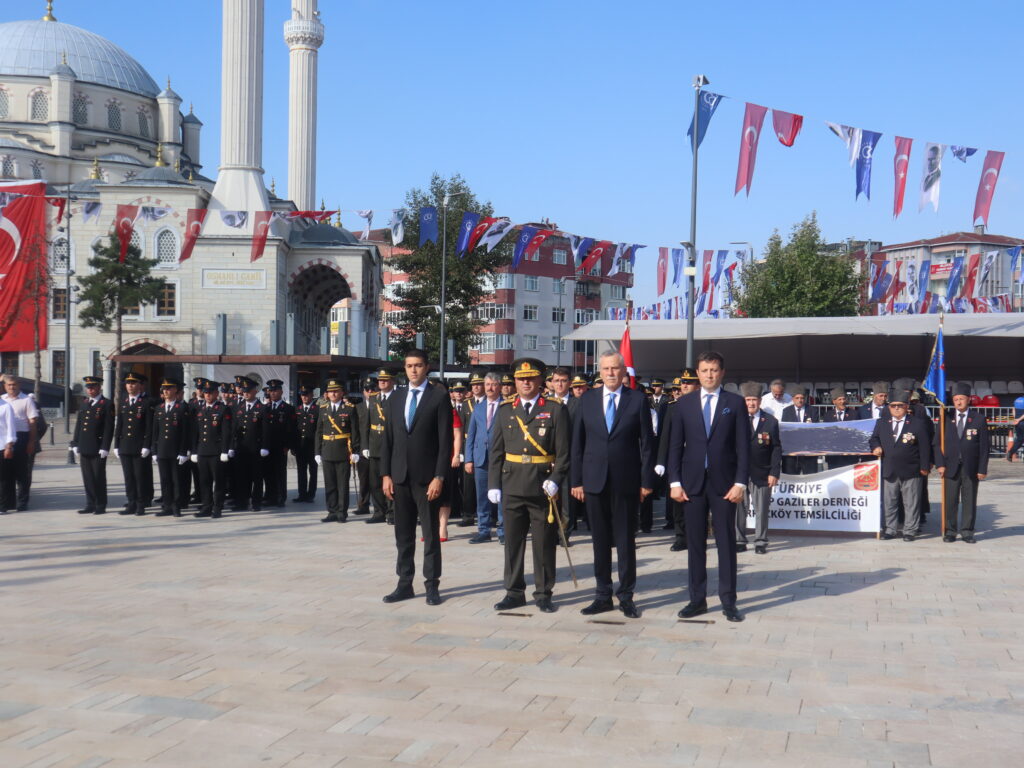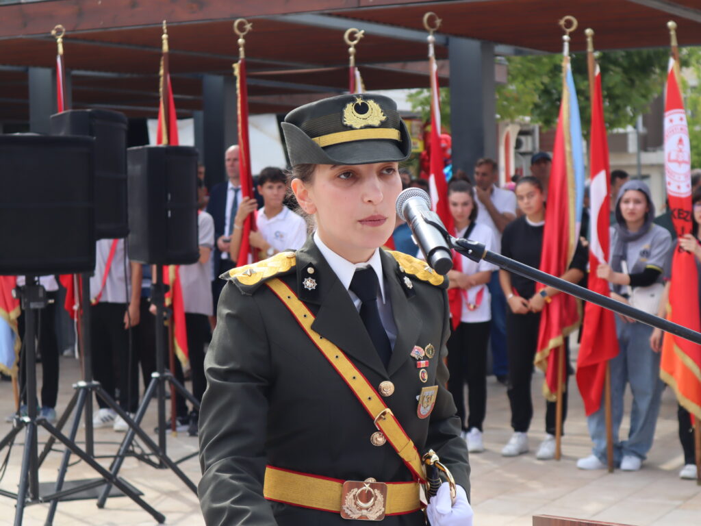 Sonrasında kutlama programı yine Cumhuriyet Meydanı’nda devam etti. Kaymakam Nazmi Günlü, Tank Kurmay Albay Erkan Bulut ve Belediye Başkanı Vahap Akay’ın törene katılanları selamlamasının ardından Saygı Duruşu’nda bulunuldu ve İstiklal Marşımız okundu. Ardından günün anlam ve önemini belirten konuşmayı 3. Zırhlı Tugay Komutanlığı’nda görevli Bkm. Teğmen Gülcan Ürekli yaptı. Tüm katılımcıları selamlamasının ardından Ürekli; “Bugün Türkiye Cumhuriyetinin kurulmasına temel teşkil eden, 30 Ağustos 1922’de kazandığımız büyük zaferin 103’üncü yılını ulusça kutlamanın haklı gurur ve heyecanını yaşıyoruz. Asil Türk milleti, kahraman Türk ordusuyla birlikte varlığına ve vatanına kastedenlere karşı, 103 yıl önce bugün kahramanlık ve şeref dolu tarihinden aldığı kudretiyle yeniden dirilerek topyekün bir varoluş mücadelesi sonucunda eşine tarihte az rastlanır bir zafer kazanmıştır. Aziz yurduna ve bağımsızlığına kast eden işgal kuvvetleri karşısında Türk ordusunun ortaya koyduğu eşsiz bir eser olan bu zaferin her safhası, tek tek düşünülmüş, hazırlanmış ve yönetilmiştir. 1900’lü yıllarında başlarında meydana gelen büyük devletler arasındaki çıkar çatışmaları, dünyada gelişen fikir akımları, sanayileşme gibi gelişmeler sonucunda birinci dünya savaşı sonunda müttefiklerin aldığı ağır yenilgiler sonucu Mondros Mütarekesi imzalanmış, imzalanan anlaşma ile bin yıldır üzerinde kan dökerek, can vererek yurt edindiğimiz Anadolu toprakları o dönemin büyük devlet ve onların maşaları tarafından işgal edilmiş, ayrıca tarihimize kara bir leke olarak geçen Sevr Anlaşması da ulusumuza dayatılmıştır. İşgal güçleri girdikleri her yerde adeta tarihi kinlerini kusarcasına kadınımıza, yaşlımıza, çocuklarımıza dünyada eşine az rastlanır işkence, zulüm, hakaretlerde bulunmuşlardır. İşte böylesine umutsuz görünen, üzerimizde kara bulutların dolaştığı bir ortamda Mustafa Kemal Paşa ve onun dava arkadaşları bağımsızlık meşalesini yakarak ‘Ya İstiklal, Ya Ölüm’ parolasıyla aydınlığa giden yolu aralamışlardır” dedi.