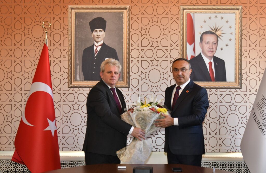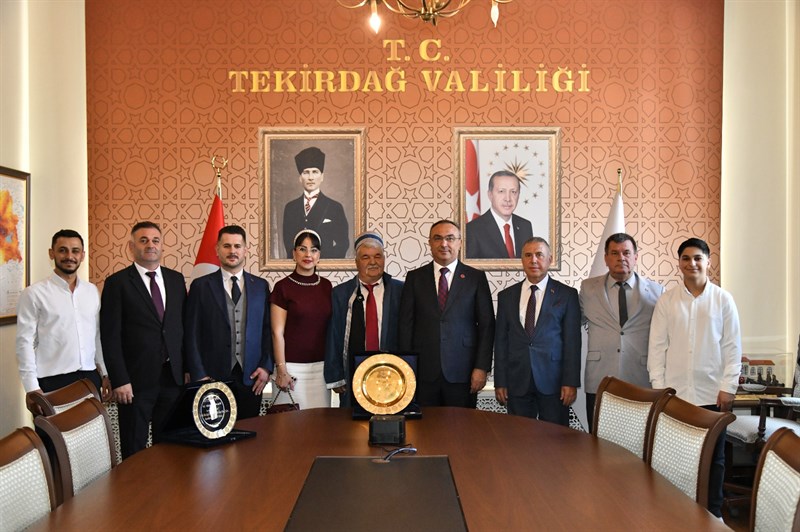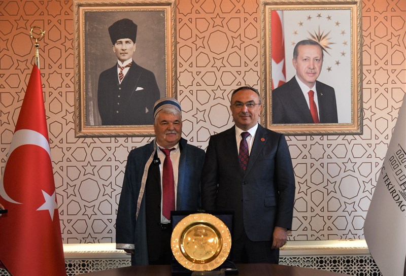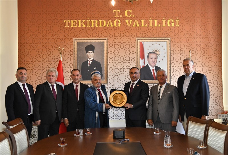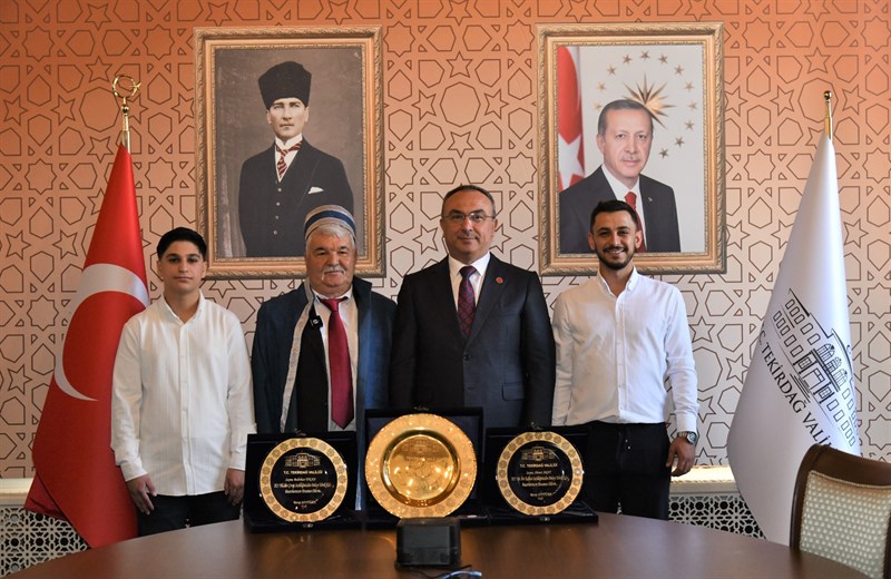 “Ahilik Haftası” kutlamaları kapsamında İlin Ahisi seçilen Ahmet Kaşarcı, İlin Kalfası seçilen Ahmet Arat ve İlin Çırağı seçilen Bedirhan Tıkna, Ticaret İl Müdür V. Mehmet Furtına, Tekirdağ Esnaf ve Sanatkarlar Odaları Birliği Başkanı Sami Kayın ve Tekirdağ Esnaf ve Sanatkarlar Kredi ve Kefalet Kooperatifi Yönetim Kurulu Başkanı Ali Rıza Eti ile birlikte Tekirdağ Valisi Recep Soytürk’ü makamında ziyaret ettiler.