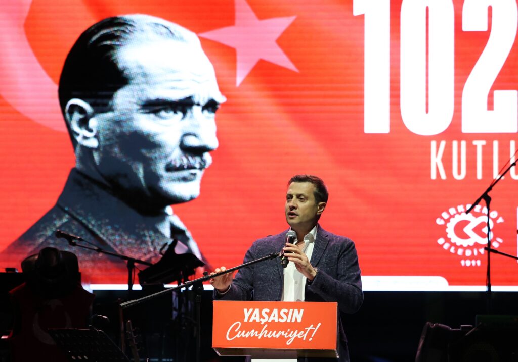 Cumhuriyetin bu inatçı ruhun eseri olduğunu vurgulayan Belediye Başkanı Akay, “Zindana attılar vazgeçmedi, sürgün edildi vazgeçmedi, İftira atıldı vazgeçmedi, davalar açtılar vazgeçmedi, yüzüstü bıraktılar vazgeçmedi, rütbelerini söktüler vazgeçmedi, idam fermanı boynunda memleketin dört bir yanında, aklında bir hayal var! O hayalin adı tek kelime Cumhuriyet. Bir aklın, bir sevginin, bir inadın, bir aşkın, bir sevdanın, bir hasretin adı Cumhuriyet… ‘Hiç aşık oldunuz mu?’ diyenlere, ‘Bir askerin sevmeye vakti olur mu?’ diyen, sevmeye, sevdaya, aşka vakit bulamayanların Cumhuriyeti. Bir ömrü dağda, dere-tepe demeden dolaşan, çadırda bir ömür süren, sevmeye vakti kalmayan bir büyük askerin Cumhuriyeti” ifadelerine yer verdi.