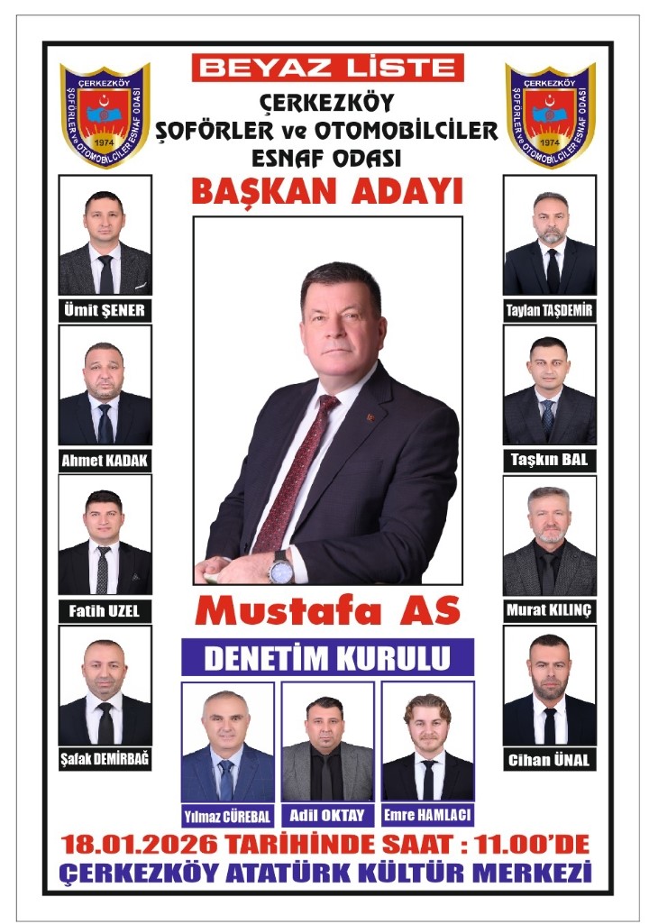 Çerkezköy Şoförler ve Otomobilciler Esnaf Odası Başkanı ve başkan adayı Mustafa As, oda üyelerini 18 Ocak Pazar günü gerçekleştirilecek olan olağan genel kurul toplantısına davet etti. Genel kurul, 11:00 – 17:00 saatleri arasında Çerkezköy Atatürk Kültür Merkezi’nde yapılacak.