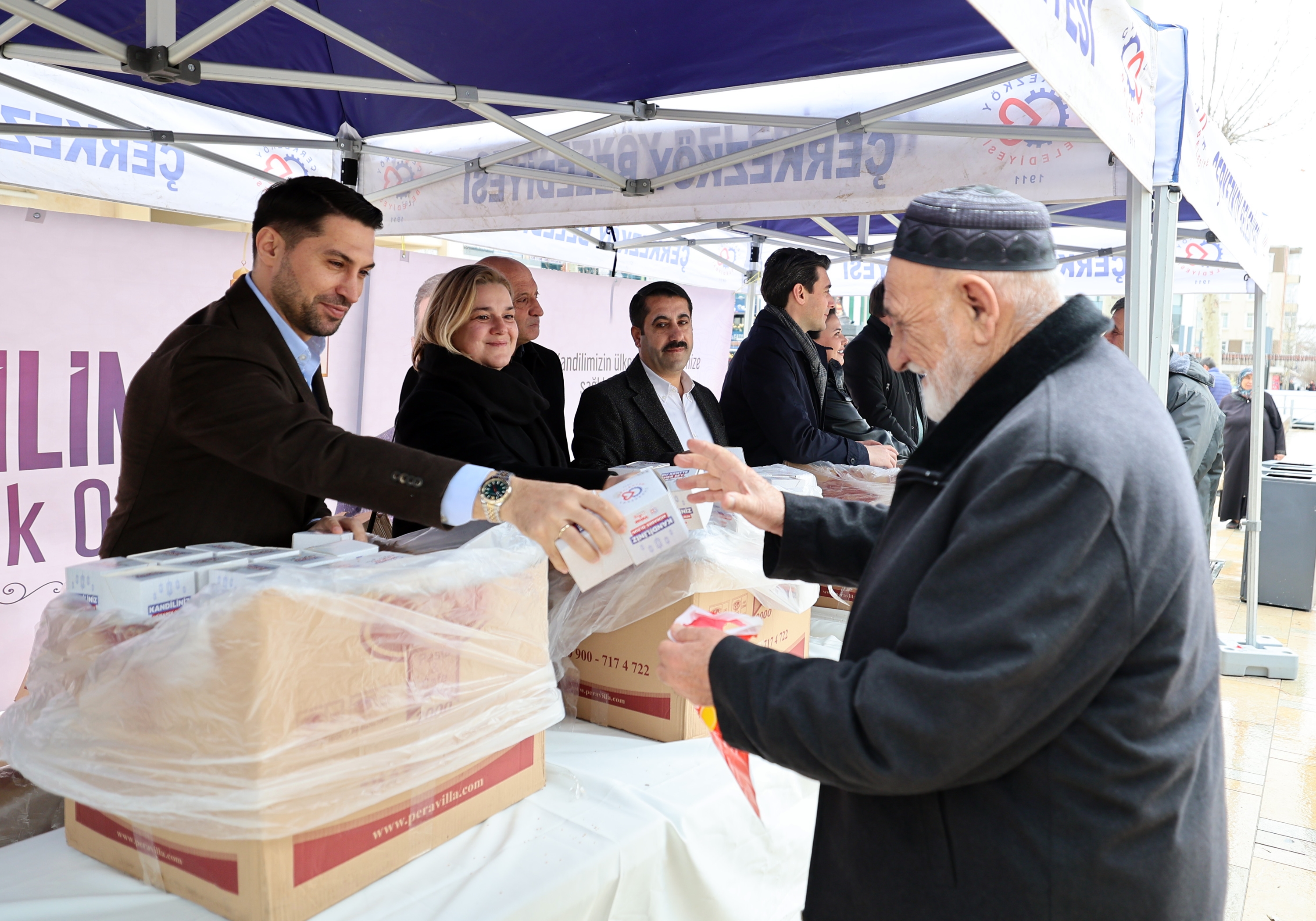 Berat Kandili nedeniyle Sosyal Hizmetler Müdürlüğü tarafından kent genelindeki kamu kurum ve kuruluşları ile Cumhuriyet Meydanı’nda oluşturulan stantta vatandaşlara kandil simidi ikramında bulunuldu. Kandil simitlerini Belediye Başkanı Vahap Akay, CHP Çerkezköy İlçe Başkanı Sedat Çolak, Belediye Başkan Yardımcıları Cengiz Memiş, Gökay Keleşoğlu ve Yunus Erçin ile Belediye Meclis Üyelerinden elinden alan vatandaşlar Çerkezköy Belediyesi ve Belediye Başkanı Vahap Akay’a kandil simidi ikramlarından dolayı teşekkürlerini ilettiler.