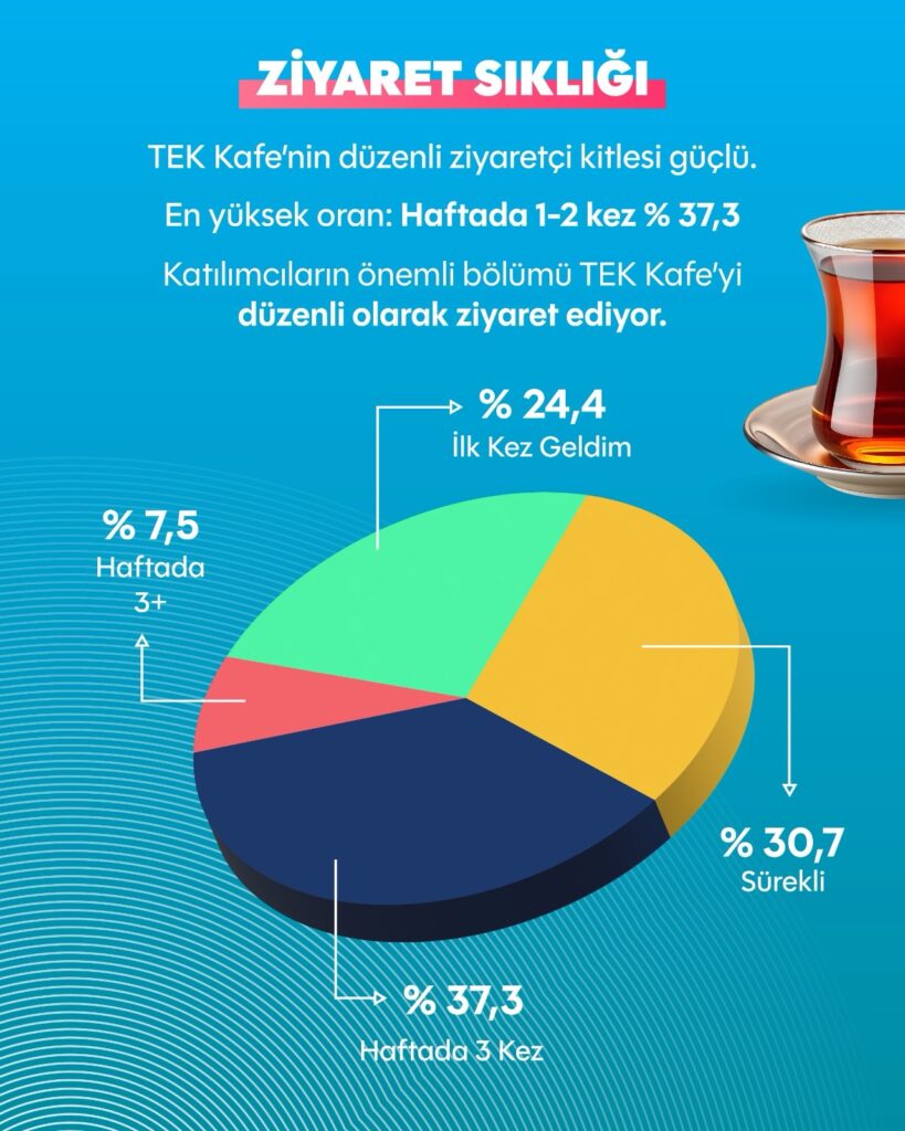 Ankete katılanların yüzde 54,2’si Tek Kafe Sahil, yüzde 21,3’ü Tek Kafe Zübeyde, yüzde 18,3’ü Tek Kafe Çerkezköy ve yüzde 6,2’si Tek Kafe Bedesten kullanıcılarından oluştu. Katılımcı profiline bakıldığında, Tek Kafe’nin düzenli bir kullanıcı kitlesi oluşturduğu da görüldü. Buna göre vatandaşların yüzde 37,3’ü haftada 1-2 kez, yüzde 30,7’si sürekli, yüzde 7,5’i haftada 3 ve üzeri sıklıkta Tek Kafe’yi ziyaret ettiğini ifade ederken, yüzde 24,4’ü ise ilk kez geldiğini belirtti.