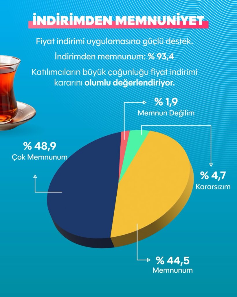 Anketin en dikkat çekici başlıklarından biri fiyat indirimiyle ilgili oldu. Katılımcıların yüzde 48,9’u “çok memnunum”, yüzde 44,5’i “memnunum” yanıtını verdi. Böylece fiyat indirimi uygulamasına olumlu yaklaşanların toplam oranı yüzde 93,4 olarak kayda geçti. Kararsız olduğunu belirtenlerin oranı yüzde 4,7, memnun olmadığını ifade edenlerin oranı ise yalnızca yüzde 1,9 oldu.