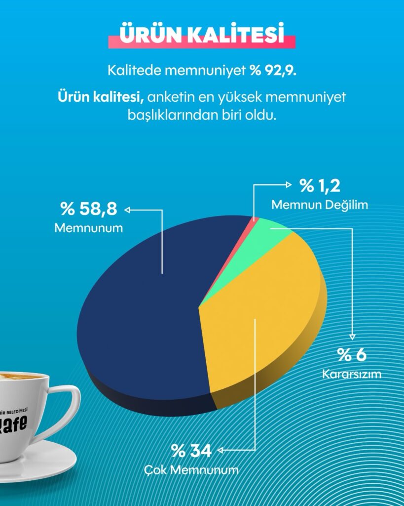 Tekirdağ Büyükşehir Belediyesi Halkla İlişkiler Şube Müdürlüğü tarafından gerçekleştirilen Tek Kafe Memnuniyet Anketi, vatandaş memnuniyetinin çok yüksek seviyede olduğunu ortaya koydu. 836 kişiyle yapılan ankette, katılımcıların yüzde 97,2’si Tek Kafe’den genel olarak memnun olduğunu belirtirken, fiyat indirimi, ürün kalitesi, temizlik ve hizmet başlıklarında da dikkat çekici sonuçlar elde edildi.