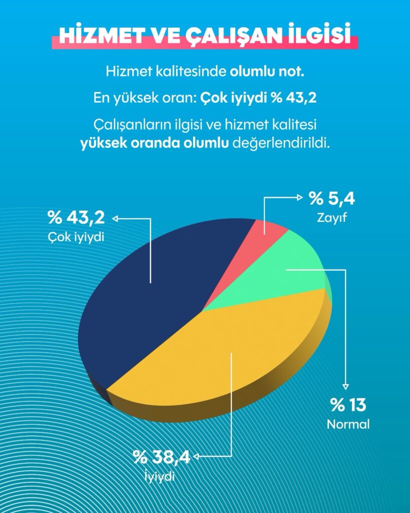 Hizmet kalitesi ve çalışan ilgisine yönelik değerlendirmeler de ankette öne çıkan bir başka başlık oldu. Vatandaşların yüzde 43,2’si “çok iyiydi”, yüzde 38,4’ü “iyiydi” yanıtını verdi. Böylece çalışan ilgisi ve hizmet kalitesini olumlu değerlendirenlerin oranı yüzde 81,6 olarak gerçekleşti. Hizmeti normal bulanların oranı yüzde 13, zayıf bulanların oranı ise yüzde 5,4 oldu.