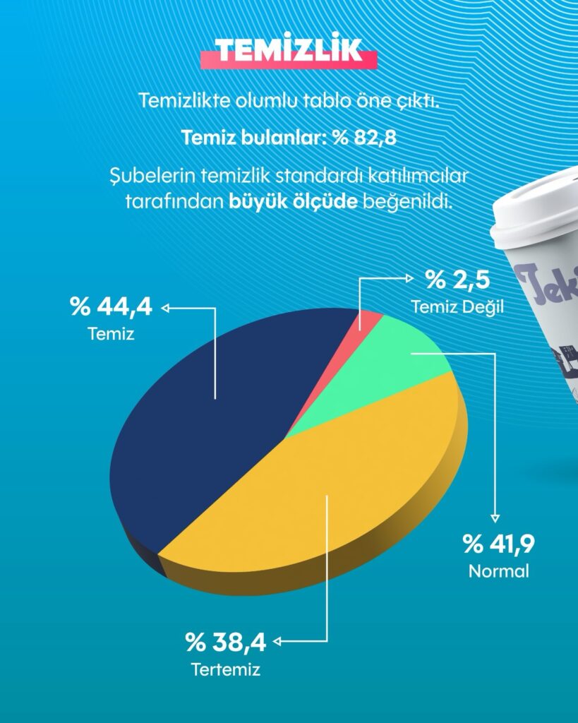 Tek Kafe şubelerinin temizlik standartlarına ilişkin sonuçlar da dikkat çekti. Katılımcıların yüzde 44,4’ü “temiz”, yüzde 41,9’u “tertemiz” değerlendirmesinde bulundu. Bu alandaki toplam olumlu oran yüzde 86,3 olarak ölçüldü. Temizliği normal bulanların oranı yüzde 11,2, temiz bulmayanların oranı ise yüzde 2,5 seviyesinde kaldı.