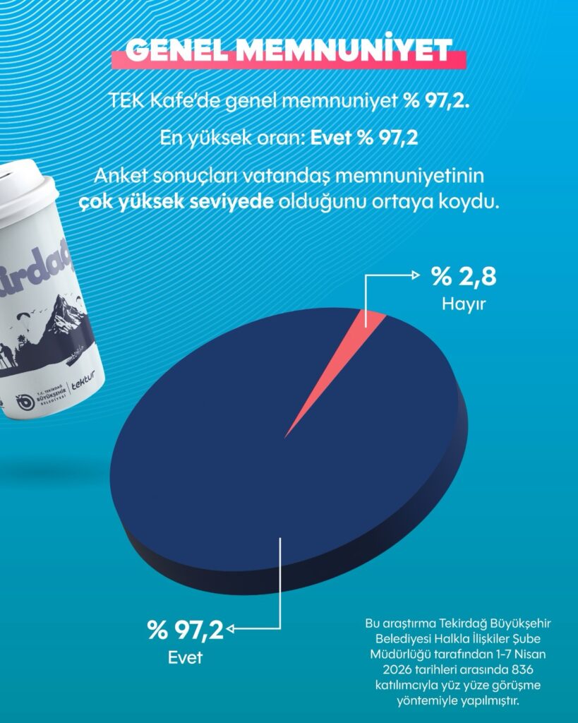 Büyükşehir Belediyesi’nin sosyal belediyecilik anlayışı doğrultusunda hizmet veren Tek Kafe işletmelerine yönelik yapılan memnuniyet anketi, vatandaşların hizmete güçlü destek verdiğini gösterdi. 07 Nisan 2026 tarihinde tamamlanan araştırmada, Tek Kafe Sahil, Tek Kafe Zübeyde, Tek Kafe Çerkezköy ve Tek Kafe Bedesten şubelerinde hizmet alan toplam 836 vatandaşın görüşüne başvuruldu.