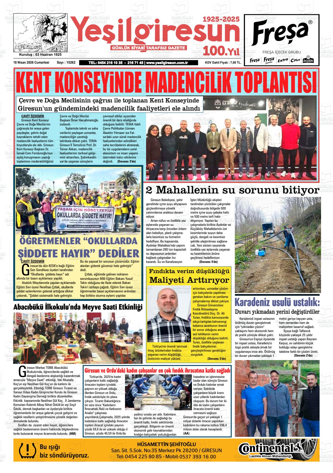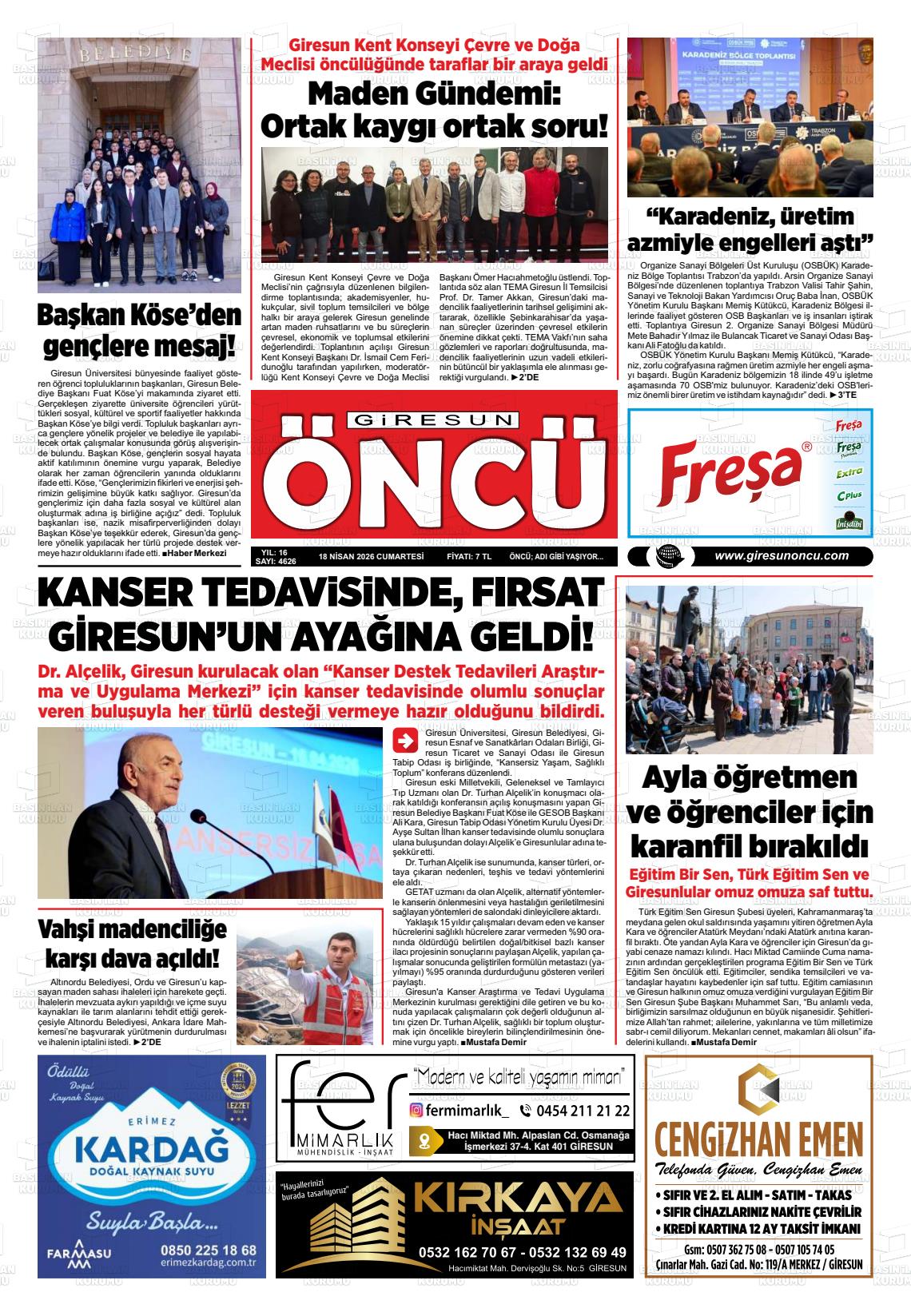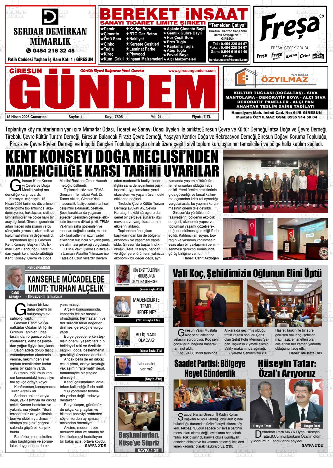 Gİresun Yerel Gazeteleri 18 Nisan 2026, Cumartesi Günü Manşeti