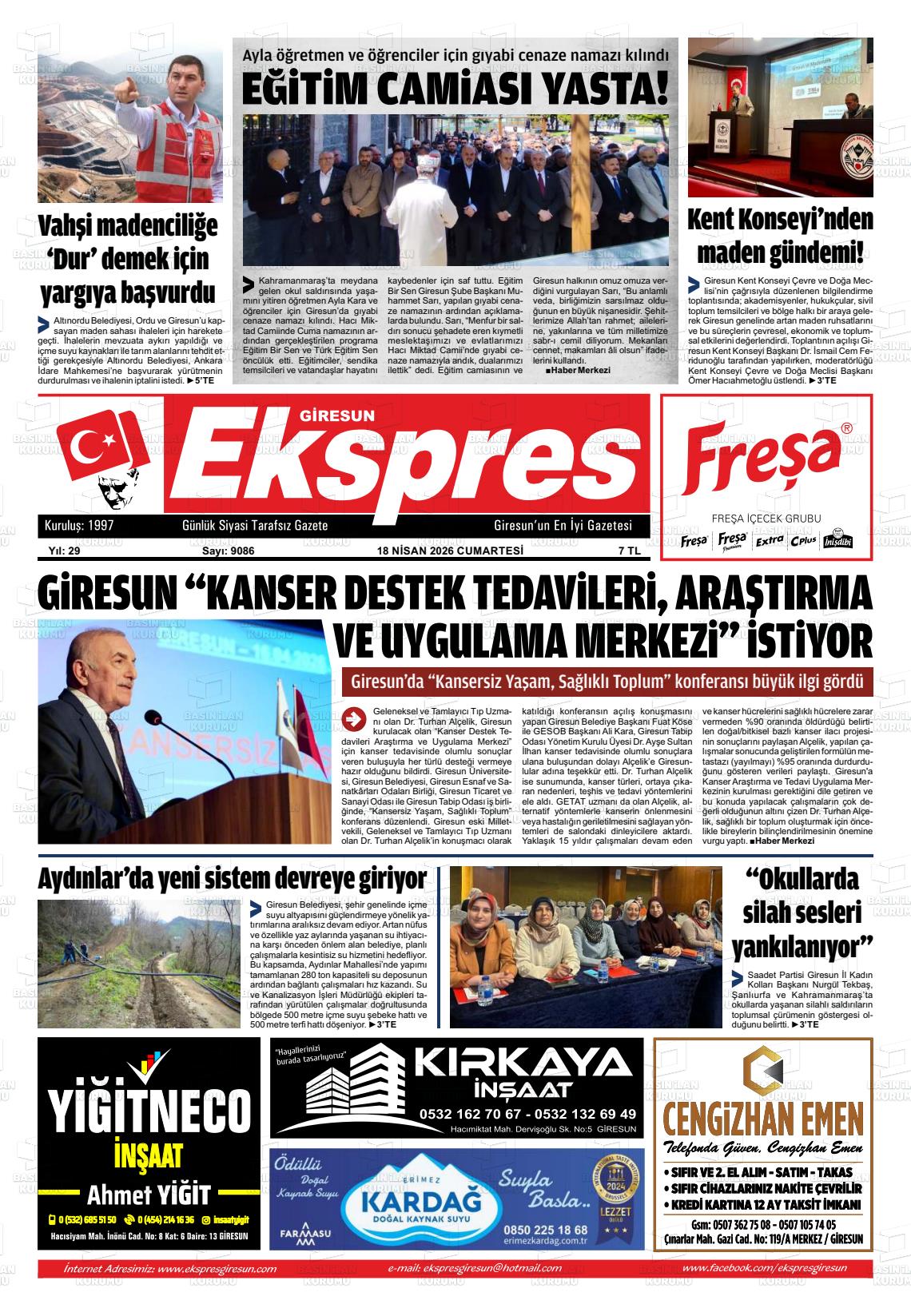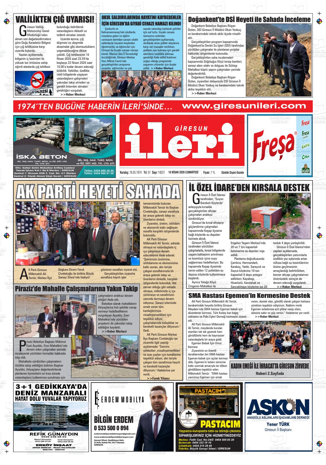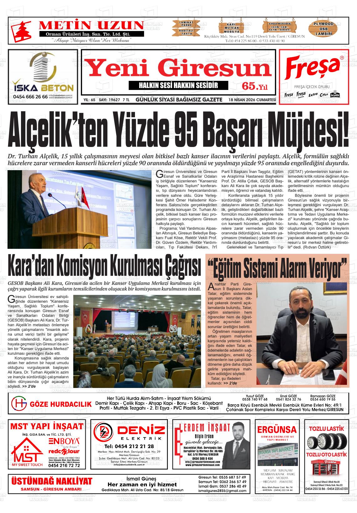 Gİresun Yerel Gazeteleri 18 Nisan 2026, Cumartesi Günü Manşeti