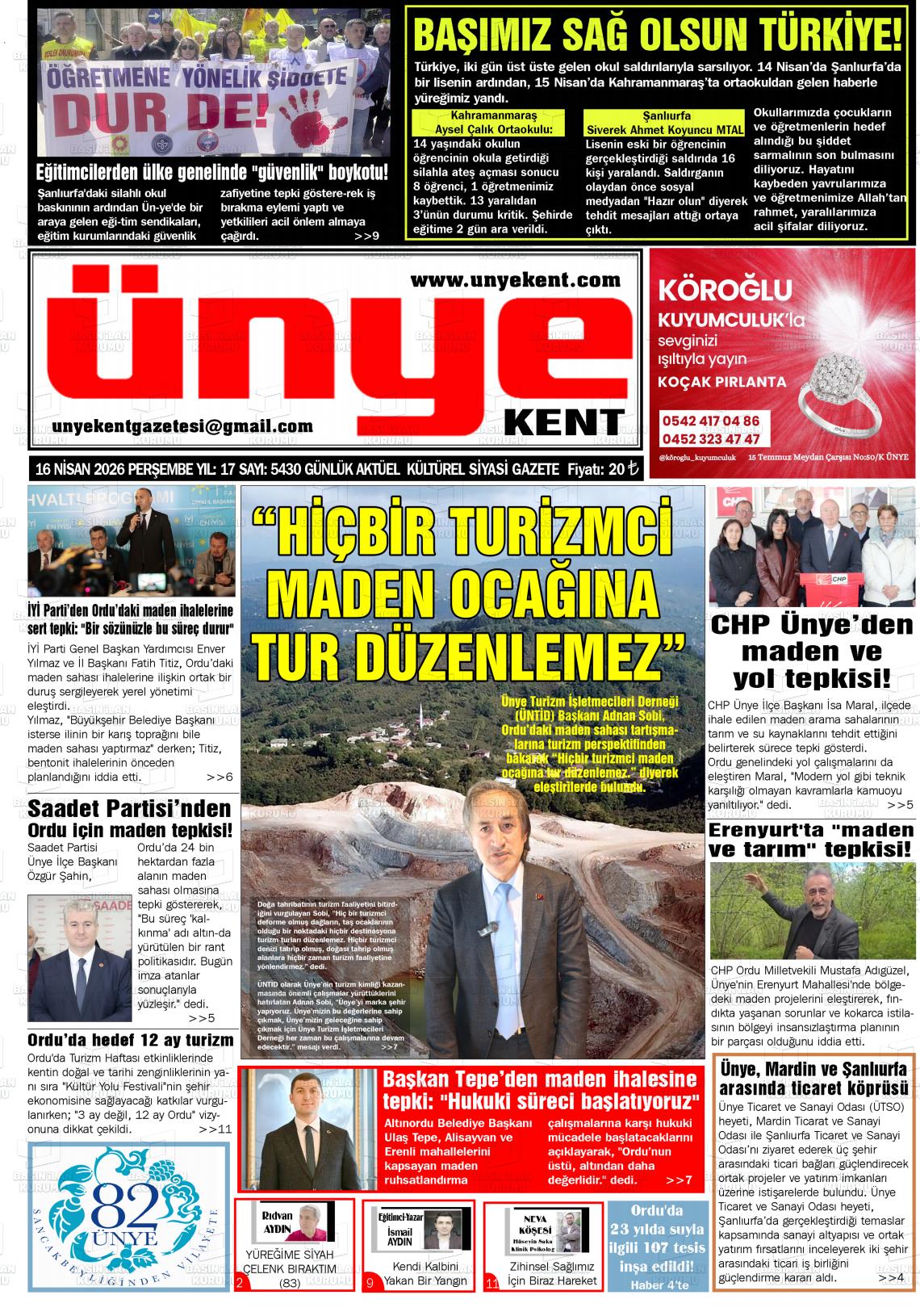 Ordu Yerel Gazeteleri 16 Nisan 2026, Perşembe Günü Manşeti
